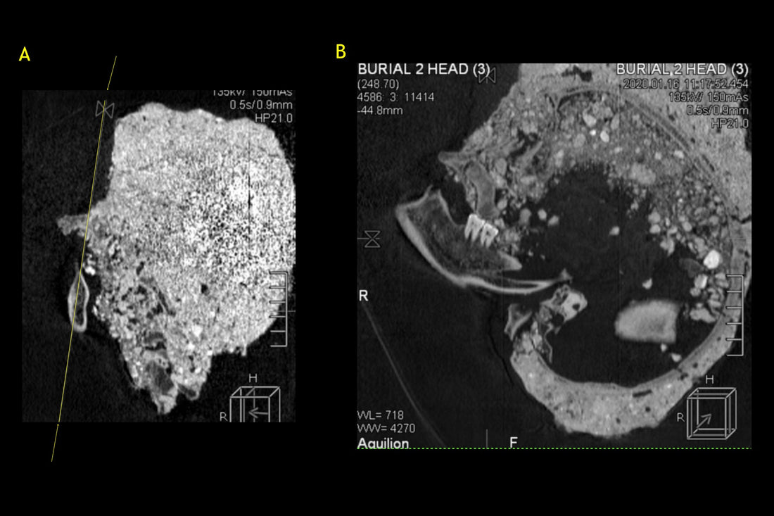 Much about people’s lives, Ullinger explains, can be extracted from their teeth—including their rough age, their diet, where they might have grown up. “Your teeth don’t fix themselves. if you chip a tooth, your tooth doesn’t grow back the way your bone would. So basically after a tooth forms, it also is a little record of your childhood. If you get very sick or… if you didn’t have enough food or if you had some kind of systemic biological stress, you can get certain markers in your teeth that your body can never fix.” Throughout this analysis, the actual skull and its teeth remain in safe storage, hidden in their block of packed soil. The CT scans, being a perfect visual assembly of the block’s every square inch, will eventually guide Bellantoni and his team when they begin the process of removing all the soil.