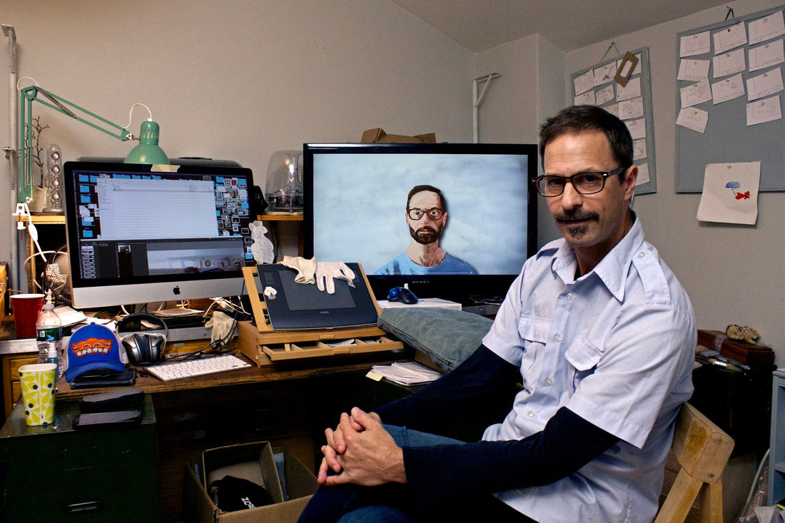 Commissioned work relieves a filmmaker of those concerns, ideally leaving enough creative leeway that the filmmaker still feels creatively engaged. The golf cart animatic on Gendron’s monitor is a particularly engaging creative effort, representing as it does the extracurricular activities of a reasonably famous alt rock musician. Gendron elaborates, “As the story goes, [the musician] was a bit of a wild man who after a concert noticed that there was a sea of red Solo cups left by the audience as they staggered home to their cars. And now here he was in this sea of cups and he thought, ‘Okay, I’m going to borrow this golf cart and mow them down.’” Having no footage of this, the documentary’s director gave the story to Gendron to animate. Gendron says, “I didn’t think I would enjoy it as much as I do. I like doing my weird, quirky things but I also like the focus and the push toward someone else’s vision.” His digital renderings will be paired with stop motion head movements from a breathtakingly accurate, poseable model of the musician—less than a foot tall—that he built for the purpose.