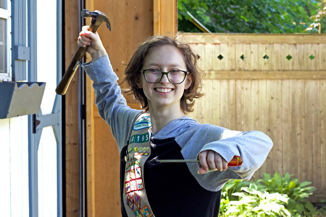 “We’re people,” Reifler says, deemphasizing gender. “We’ve got interests. My entire Gold Award project was about building with wood, and saws, and my literally favorite part was using the giant tabletop saw.” She demonstrates the motion of guiding the saw down onto a plank of wood. “Awesome!”