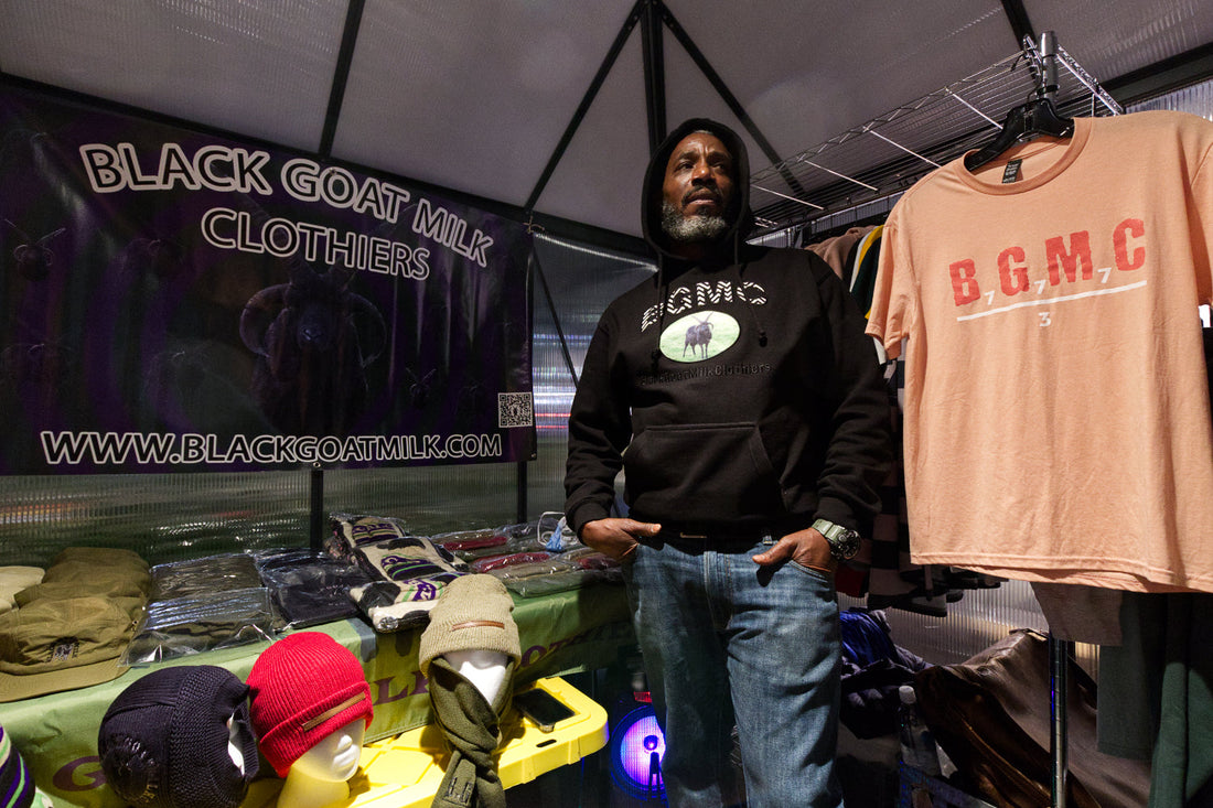 Anthony Murrell, the designer behind year-old local menswear brand Black Goat Milk Clothiers, expressed gratitude for the chance to “get out there and do what’s in your heart.” Standing next to his booth filled with branded tees and sweats, sporty rugby shirts and wintery knits that look ready to hit both the streets and the slopes—plus a bombastic selection of what I’m calling pop graffiti prints by local DJ/fine artist Dooley-O—Murrell, 50, described his business as a dream deferred. He’d been studying fashion when the Great Recession knocked him off his intended course. But it was during another disruption, the pandemic, that he realized he couldn’t wait any longer. With an eye toward “bigger, loftier things” including “more cut and sew” in the future, for now he’s smartly building a customer base with well-crafted basics.