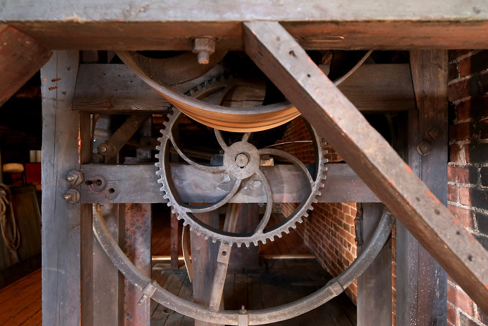 The latter’s not the kind you ride, though. It’s an ancient hoist apparatus once used to lift objects up and down the building’s four floors. Occupying its own room in ACME’s attic, it’s got large toothed gears, hefty cast wheels and a wooden driveshaft—a cylinder that extends several feet sideways and spans a hatch in the floor, where whatever it was lifting could pass up or down. As the shaft rotated in the “up” direction, Farnsworth says, long leather belts attached to this or that cargo would wind around it. The hoist would have been connected to a source of power—perhaps, in the machine’s earliest days, via a line shaft, the kind commonly used to distribute energy throughout industrial buildings before the proliferation of electricity.