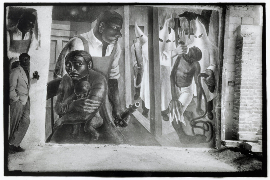 The mural’s figures are larger than life. The victim of a lynching slumps on the right side of the panel, a cut piece of rope around his neck; the other end is still knotted around a broken tree branch. Three figures in white Klan robes surround him while a fourth, clutching a shotgun, looks on from behind. The scene is viewed through a window; we are inside a room with the mural’s primary figure, another Black man, holding the barrel of a rifle in one hand and shielding a woman and infant with the angle of his body. The mother, in turn, clutches her child to her breast. Her eyes are frightened; the baby’s are open and knowing, as if they see already what it means to be a Black child in Jim Crow America.