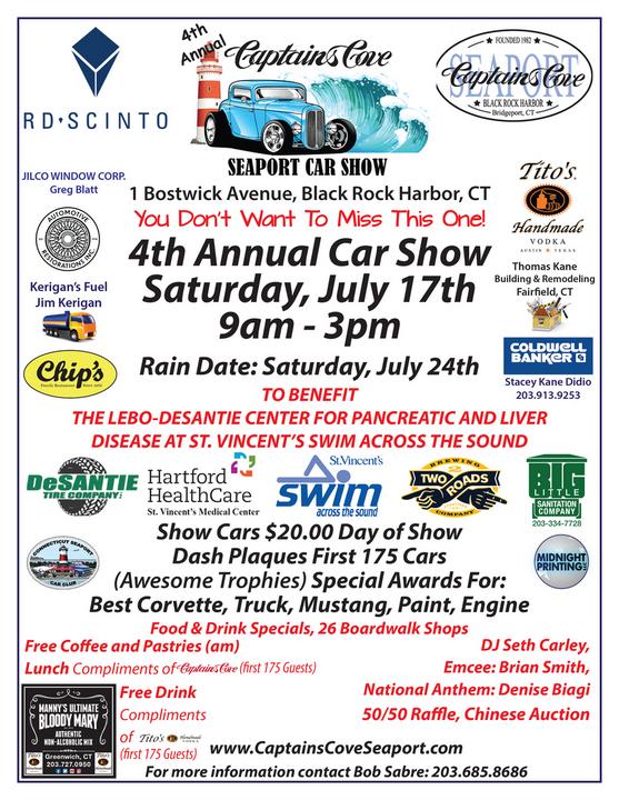 The fourth annual car show at Captain’s Cove Seaport (1 Bostwick Ave, Black Rock Harbor, Bridgeport) runs from 9am to 3 and promises “food and drink specials [at] 26 boardwalk shops,” “free coffee and pastries” in the morning, a complimentary lunch and cocktail for the first 175 guests and 50/50 as well as ticketed raffles.