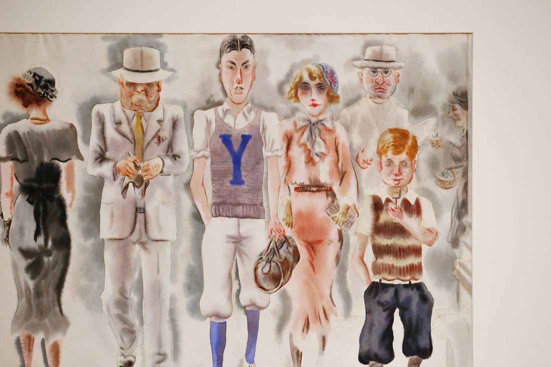 Likewise, George Grosz’s 1939 watercolor The American Scene seems humorous at first, with its cartoonish figures large in the frame: a mustached man in Yale vest and white knickers, a blonde woman in a pink dress, an old businessman with a handkerchief, a boy eating candy on a stick. But gray, smoke-like shadows outline each figure. Each visage is pinched. Literally marginalized, cut off by the edge of the painting, an old woman sells flowers from a basket. The other figures, meanwhile, walk past her with such purpose that it seems they might barge off the paper and trample the viewer. Perhaps this is how Grosz himself—a German exile “targeted by the Nazis”—felt in his adopted American home.